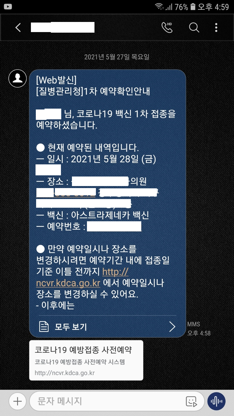 해야하니 이름과 주민번호를 알려달라고요. 그래서 알려드렸더니, 10분후에 예약 문자가 와서, 내일(금요일)에 접종하게