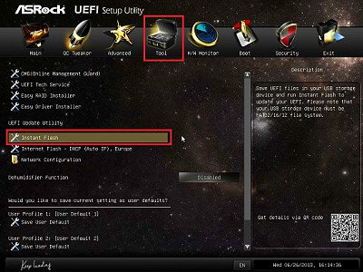 USB를 꼽은채로 재부팅하고 Del 키를 눌러서 바이오스로 진입한 후에 Tool 메뉴에서 Instant Flash 를 선택합니다.