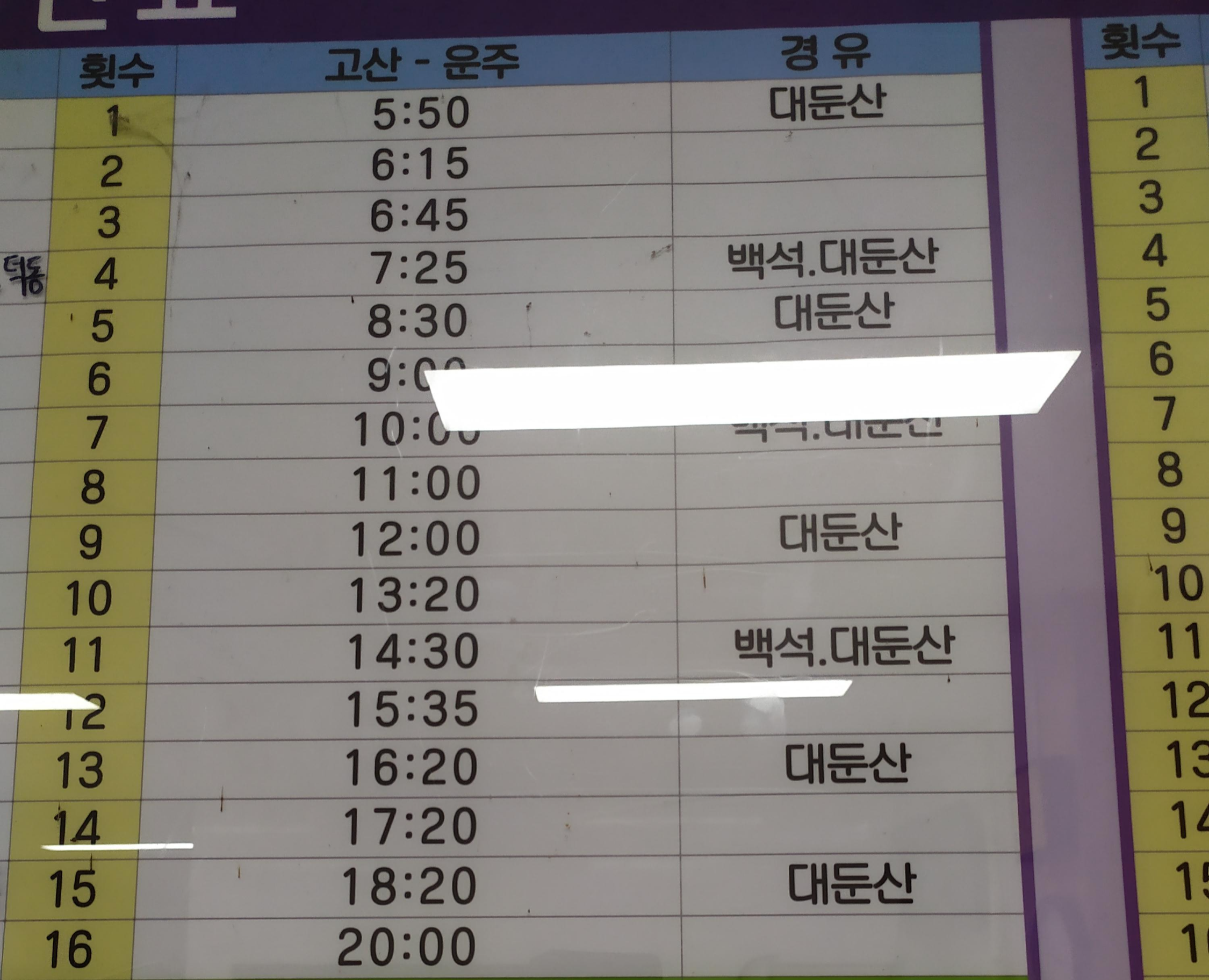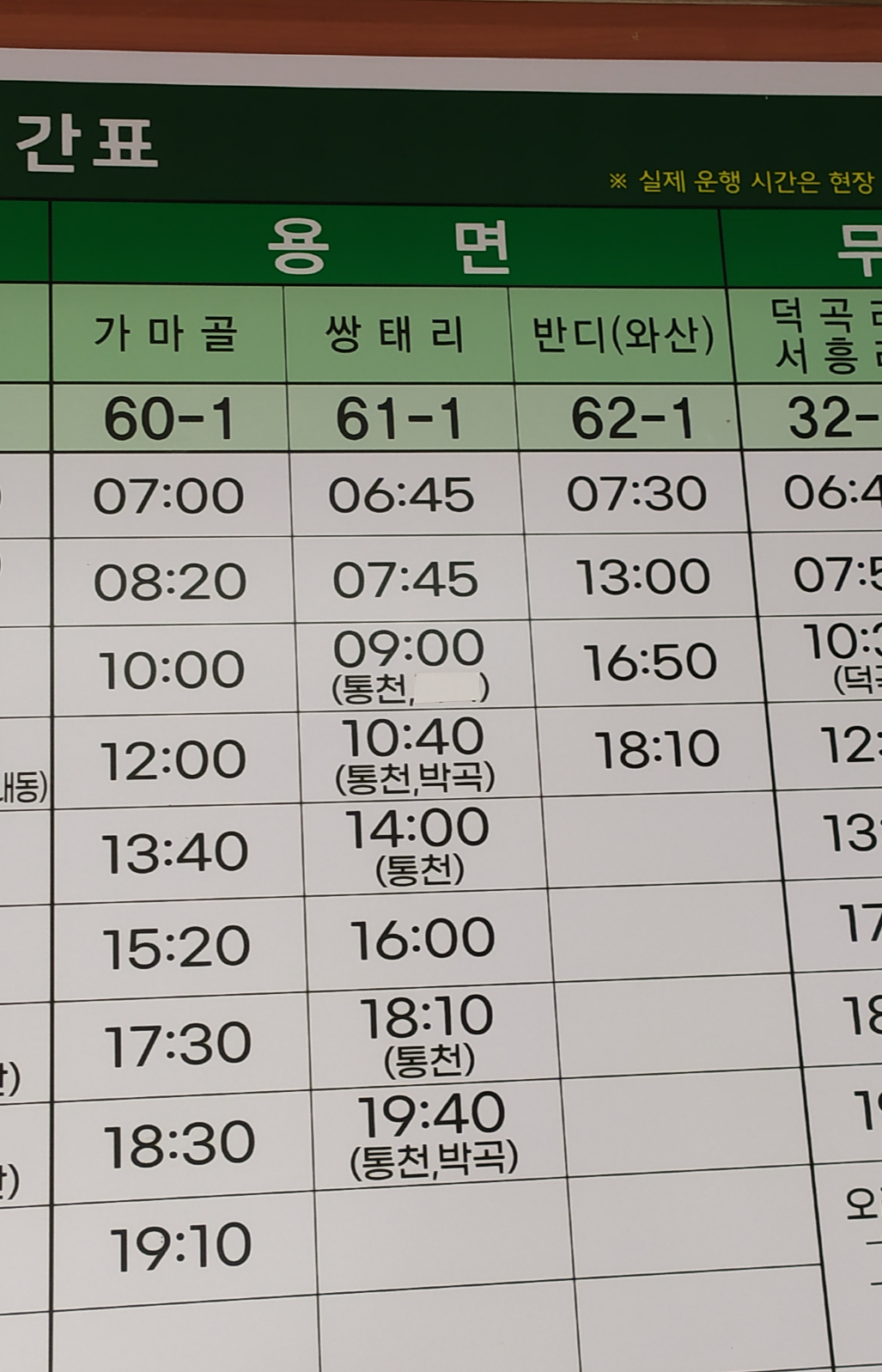 07시 30분에 담양 터미널에 도착하여 시간표부터 확인해줍니다. 담양터미널에서 가마골로 가는 60-1번을 타고